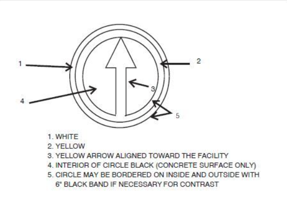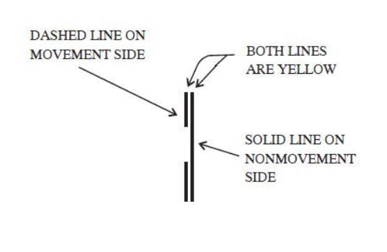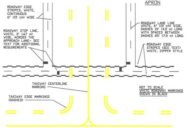 The boundary consists of two yellow lines (one solid and one dashed) 6 inches in width. The solid line is located on the nonmovement area side, while the dashed yellow line is located on the movement area side. A depiction is below: